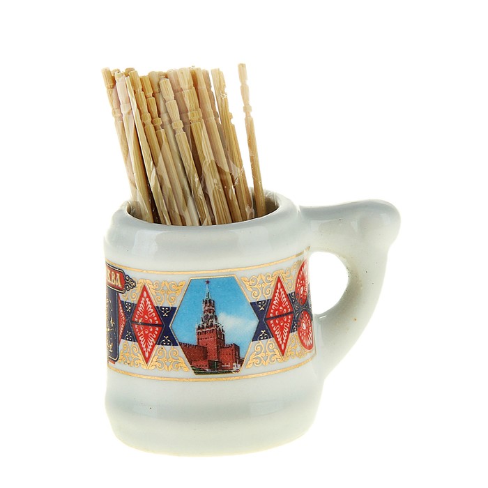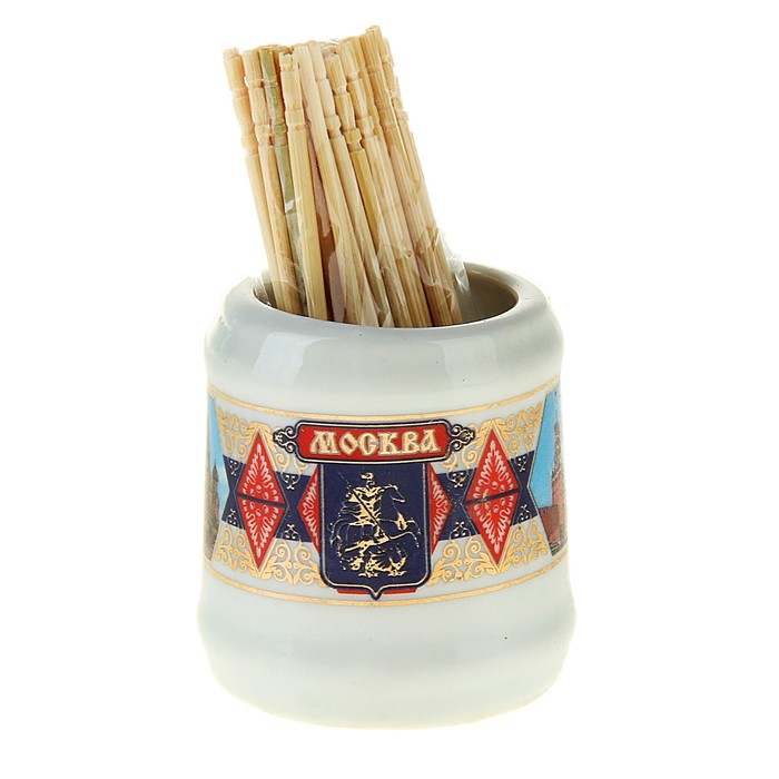 Кружка с зубочистками «Москва» изготовлена из белоснежной керамики. Яркие изображения нанесены натуральными и безопасными красками. Внешний вид изделия с прорисовкой популярных достопримечательностей разработан дизайнерами компании Сима-ленд. Такая кружка — не просто достойное украшение интерьера, а ещё и полезный в хозяйстве предмет.