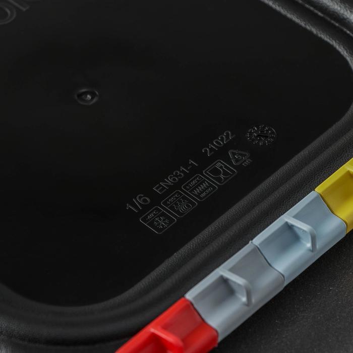 Крышка к гастроемкости 1/6, черная оборудована специальными цветными клипсами, которые позволяют быстро определять содержимое гастроёмкости. Условные обозначения: