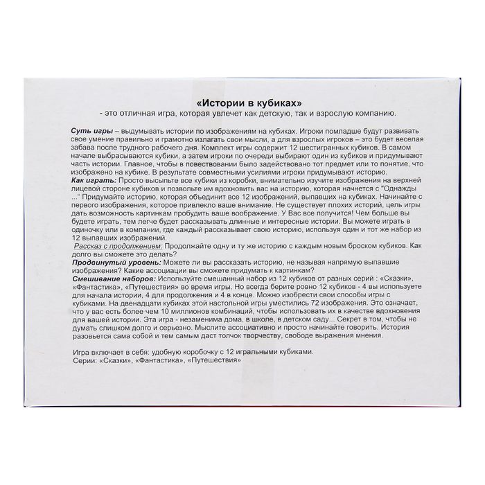 Такая игра увлечёт и детскую, и взрослую компании. Сочиняйте сказочные сюжеты по изображениям на кубиках. Придумывайте различные варианты игр. Набор позволит детям пофантазировать и поможет научиться правильно и излагать свои мысли. В комплект входит 12 предметов.