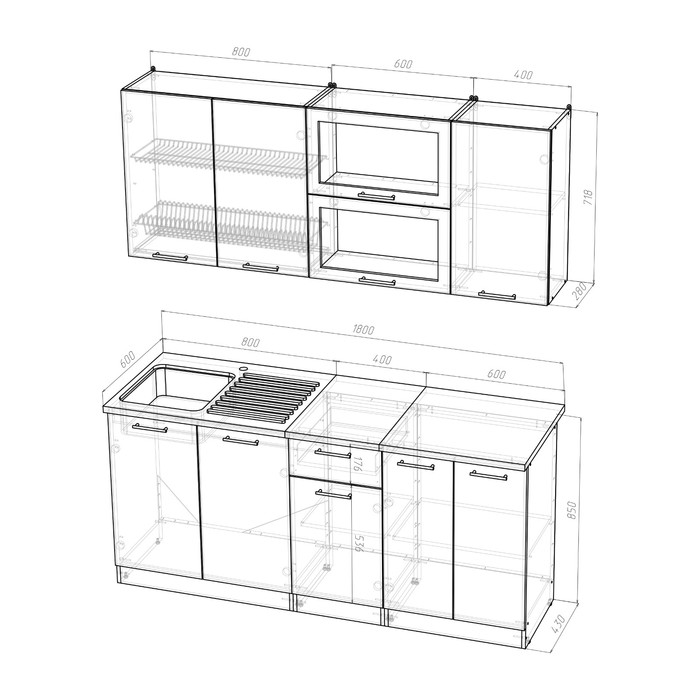 Кухонная мойка, стеновая панель, решётка для посудосушителя в комплект не входят.
