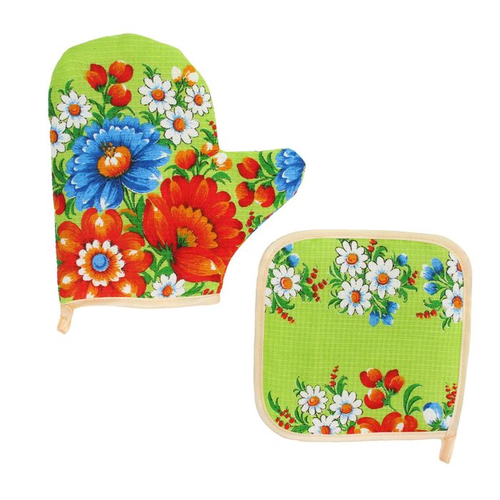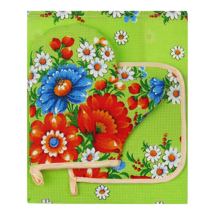 Кухонный набор "Ромашки" полотенце 45х60, прихватка 17х17, рукавичка 20х23 зеленый