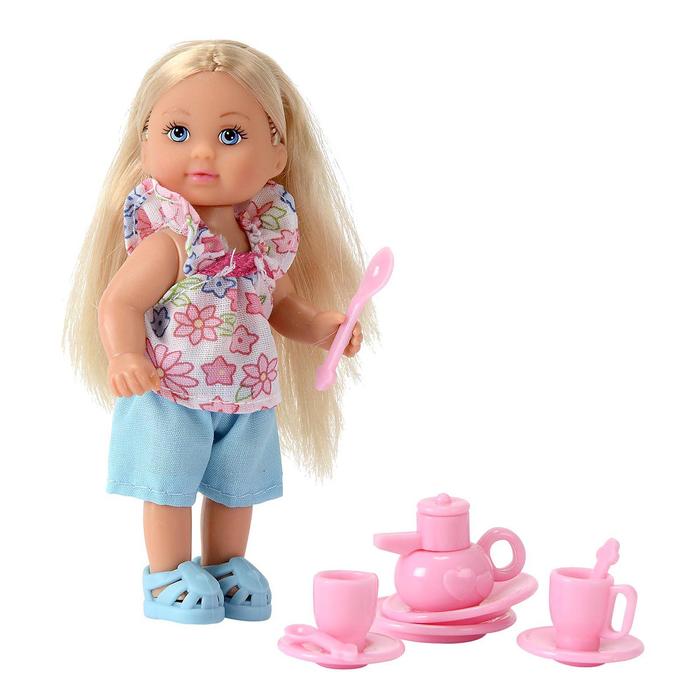 У куклы двигаются руки, ноги и голова. Локоны Еви очень длинные, их можно заплетать и придумывать новые образы с помощью расчёсок и фена из комплекта «Еви и аксессуары для волос». В наборе «Еви с посудой» есть целый сервиз, с ним можно разыгрывать множество сюжетов чаепития.