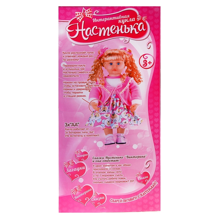 Функции: кукла распознает голос и отвечает каждый раз по разному; смеется, открывает и закрывает глазки, выражает свои эмоции; при нажатии на правую ручку, кукла прекращает всякие действия, при длительном нажатии руки, кукла переходит в спящий режим; кукла рассказывает сказки, разгадывает загадки. Кукла работает от трех батареек типа "АА", в комплект не входят.