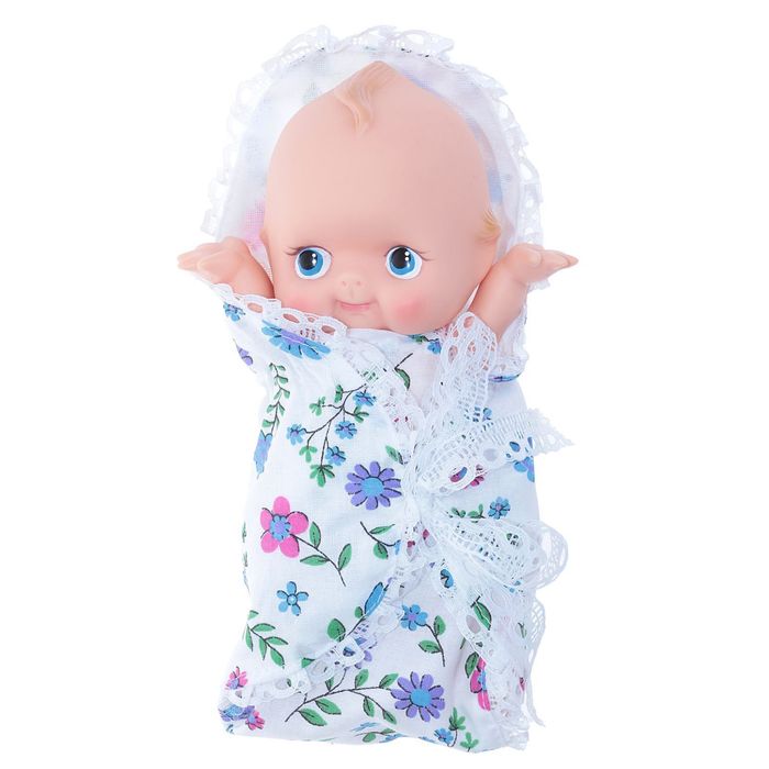 Пупсик одет в распашонку и завёрнут в конверт для новорождённого.