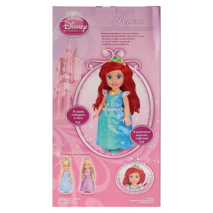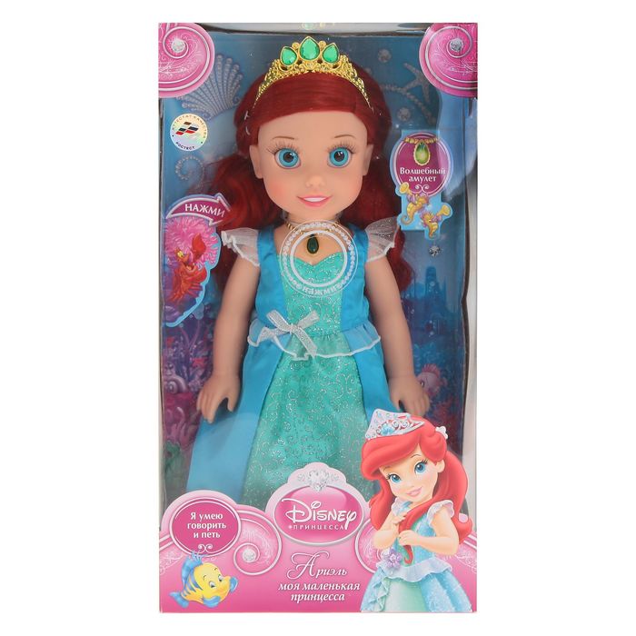 На шее Ариэль — волшебное ожерелье. Если нажать на него, кукла проговорит фразы, расскажет стихи или споёт песню: