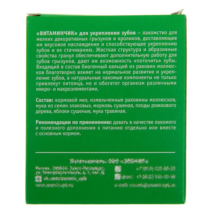 Лакомство для мелких декоративных грызунов и кроликов обладает приятным вкусом и поддерживает здоровье зубов. Особая структура и абразивные свойства гранул эффективно укрепляют и стачивают зубы.