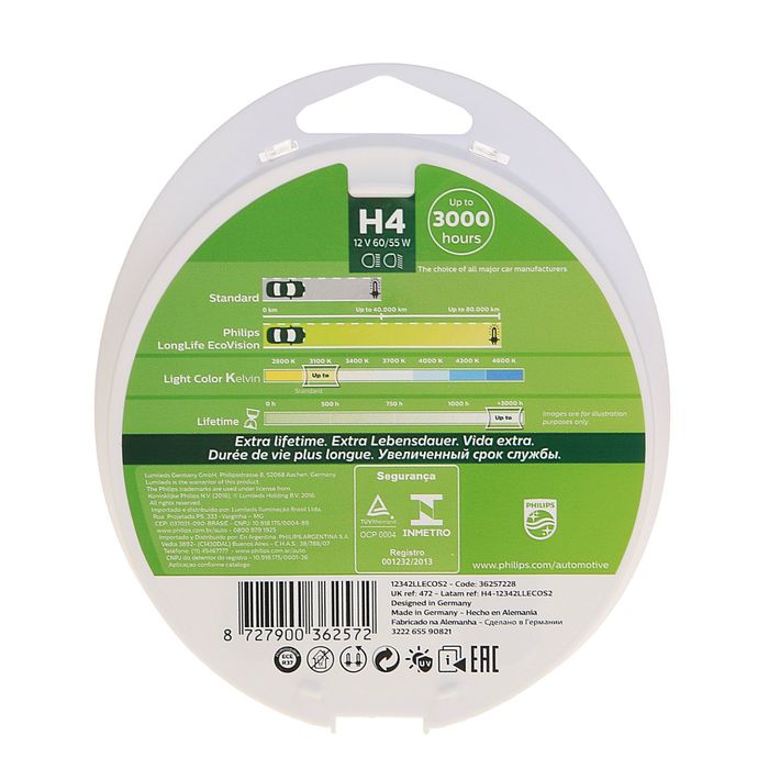Лампа автомобильная Philips, LongLife EcoVision, H4, 12 В, 60/55 Вт, P43t, 2шт.