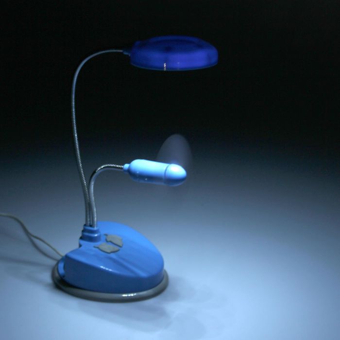 Прибор действительно удобен: компактная подставка даёт возможность поставить его на угол стола, плафон и вентилятор подвижны (они поднимается и опускается на достаточную для вашего комфорта высоту), работает и от батареек 3ААА и от USB-провода, имеет две автономные кнопки.