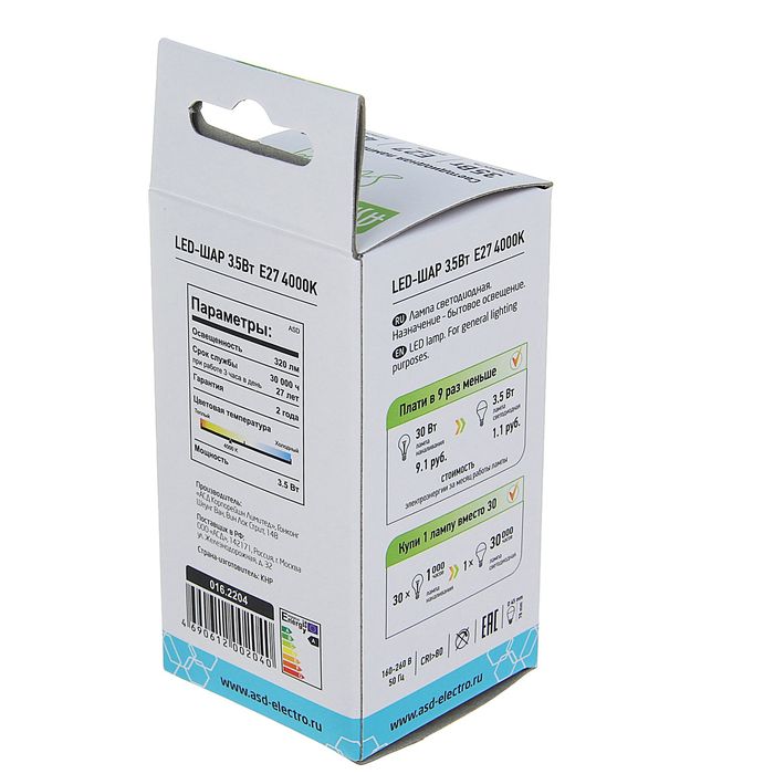 Светодиодная лампа ASD Е27 предназначена для подсветки и акцентного освещения, например, в качестве декора интерьера. Она улучшит условия освещения и поможет снизить уровень потребления электроэнергии.