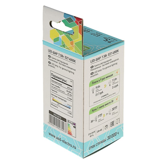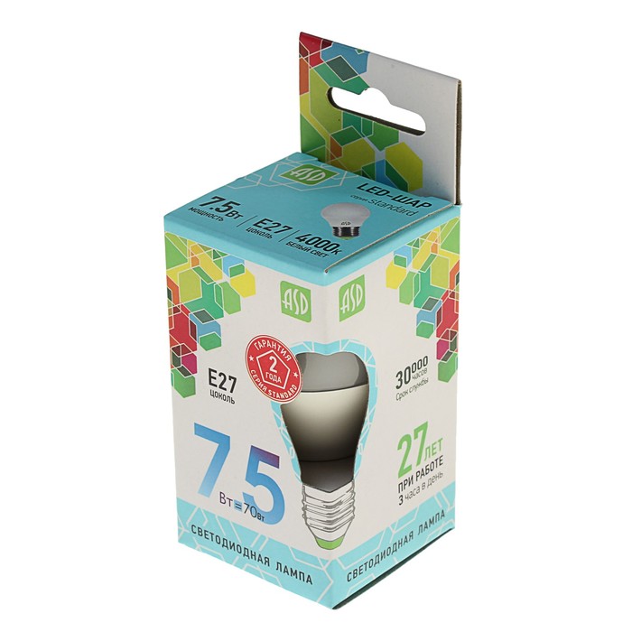 Лампа светодиодная ASD, Е27, 7.5 Вт, 210 - 240 В, 4000 К, 675 Лм, "шар"