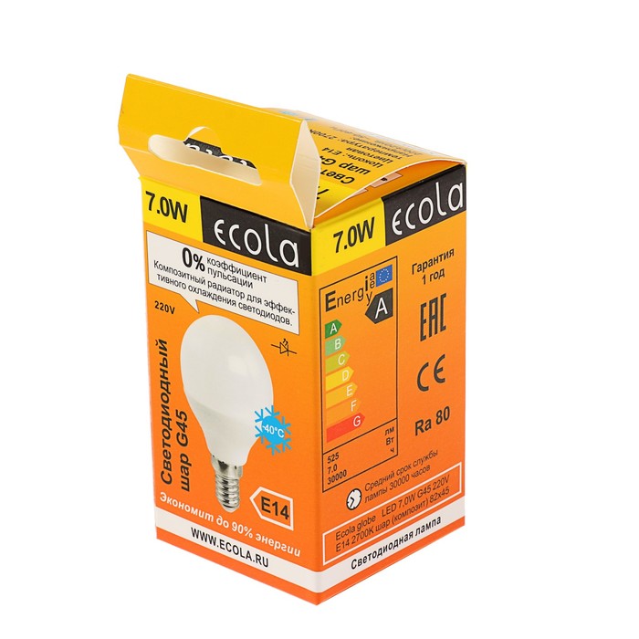 Лампа светодиодная Ecola, E14, 7 Вт, 2700 К, 77x45 мм, "шар"