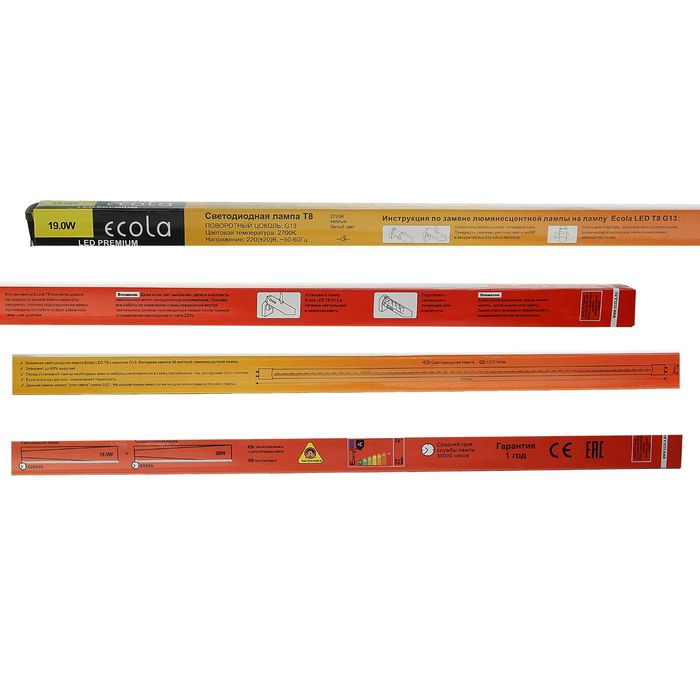 Лампа светодиодная Ecola, G13, T8, 19 Вт, 2700 К, 1213x26 мм, с поворотными цоколями