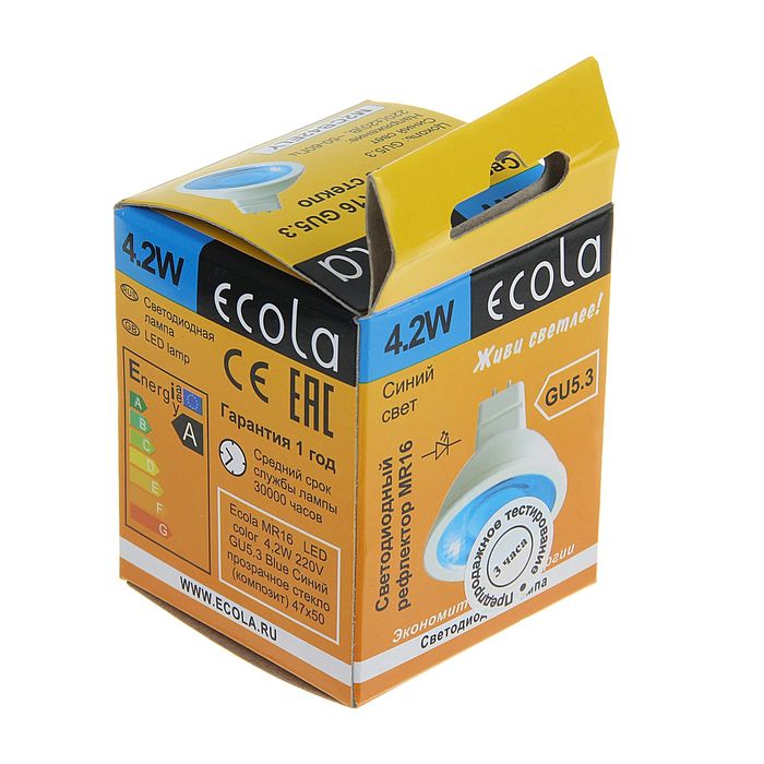 Лампа Ecola предназначена для дополнительного и основного освещения. Излучаемый синий цвет используется при разработке дизайна интерьера в квартирах. Средний срок службы лампы составляет 30 000 часов.
