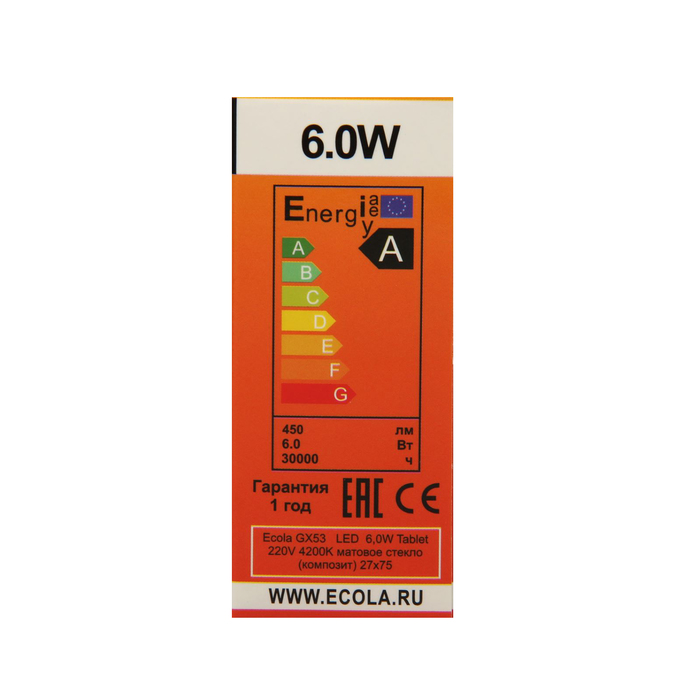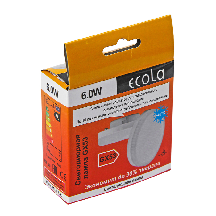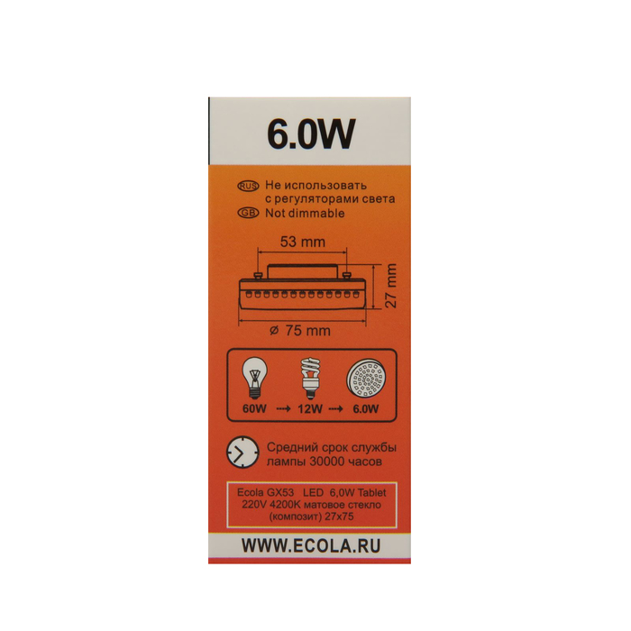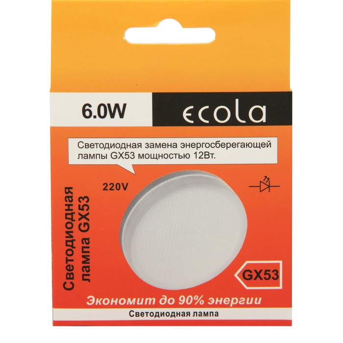 Лампа светодиодная Ecola GX53, 6,0 Вт, 220 В, 4200 K, матовое стекло, 27x75