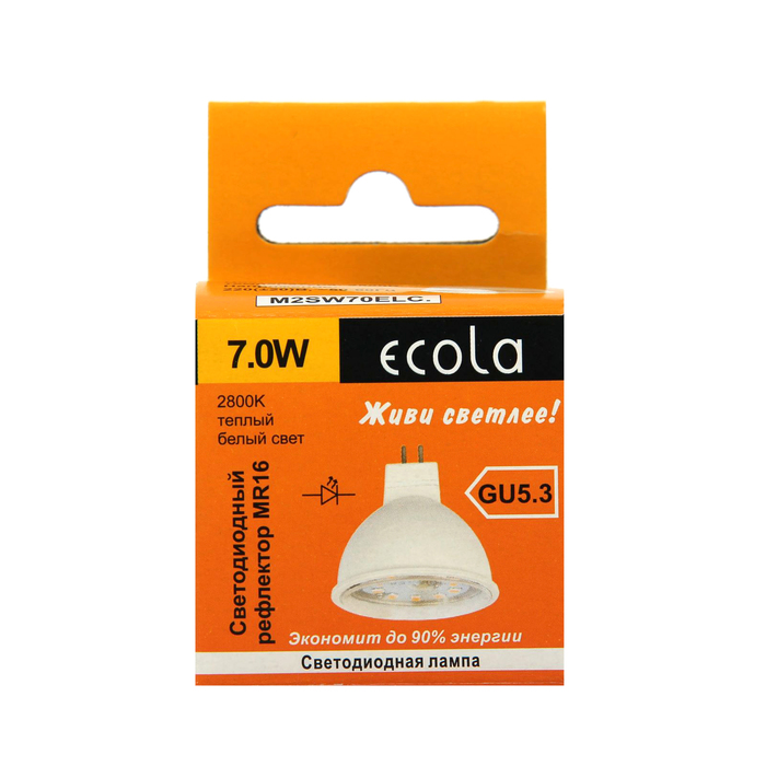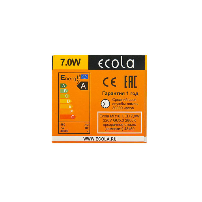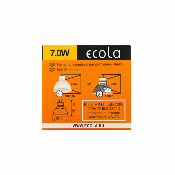 Лампа светодиодная Ecola, MR16, GU5.3, 7,0 Вт, 220 В, 2800 K, прозрачное стекло, 48x50