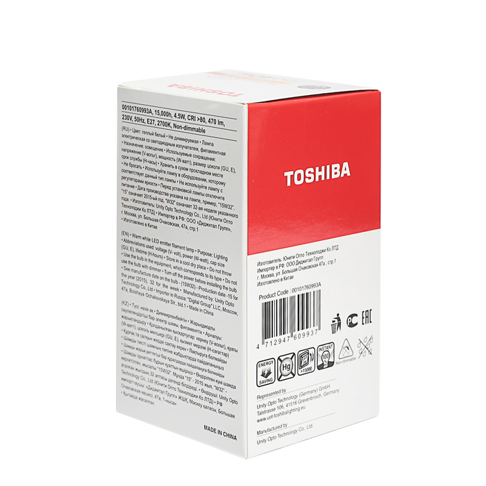 Невозможно представить себе современный мир без электроприборов. Благодаря качественным материалам и работе дизайнеров они способны сделать нашу жизнь комфортнее и порадовать глаз. Лампа светодиодная филаментная TOSHIBA, A60, 4.5 Вт, E27, 470 Лм, 2700 K — прекрасный выбор, если вы находитесь в поиске товара, который идеально впишется в ежедневную жизнь и прослужит долго.