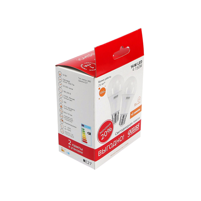 Лампа светодиодная Gauss Elementary A60, 14 Вт, E27, 2700 K, (2 лампы в упаковке)