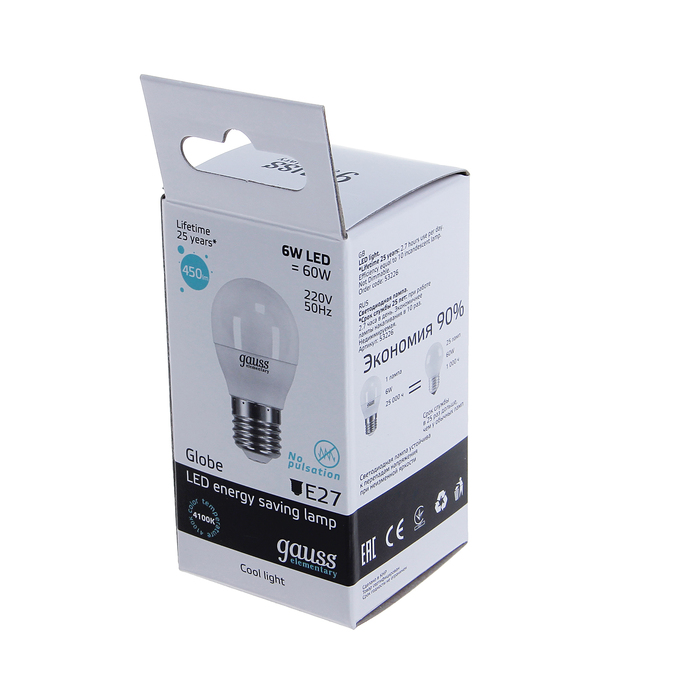 Лампа светодиодная Gauss, Elementary, G45, E27, 6 Вт, 4100K