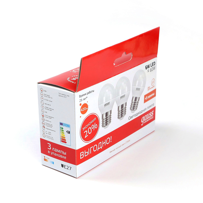Невозможно представить себе современный мир без электроприборов. Благодаря качественным материалам и работе дизайнеров они способны сделать нашу жизнь комфортнее и порадовать глаз. Лампа светодиодная Gauss Elementary Globe, 6 Вт, E27, 2700 K, (3 лампы в упаковке) — прекрасный выбор, если вы находитесь в поиске товара, который идеально впишется в ежедневную жизнь и прослужит долго.