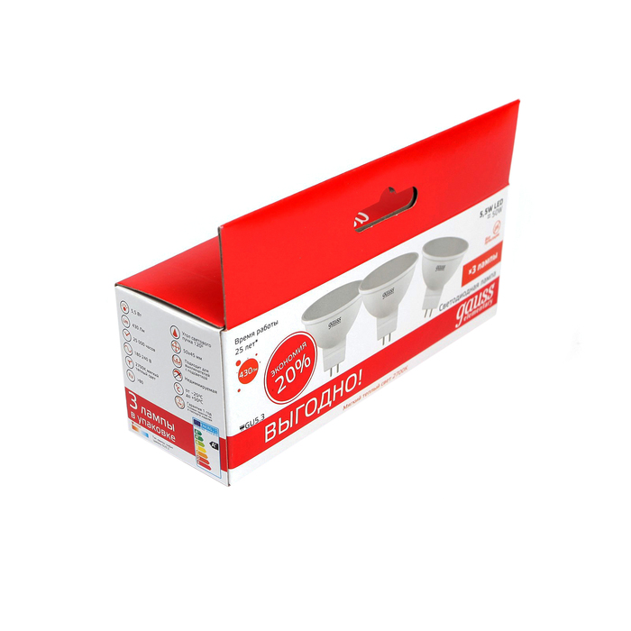Лампа светодиодная Gauss Elementary MR16, GU5.3, 5.5 Вт, 2700 К, (3 лампы в упаковке)