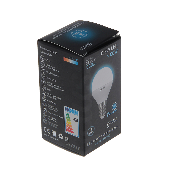 Лампа светодиодная Gauss, G45, E14, 6.5 Вт, 4100K
