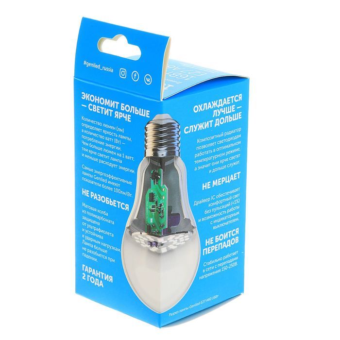 Светодиодные приборы работают дольше и потребляют в несколько раз меньше электроэнергии, чем лампочки накаливания. Матовый корпус изготовлен из поликарбоната и не разобьётся при падении. Изделие имеет композитный радиатор, который защищает от перегрева и продлевает срок службы.