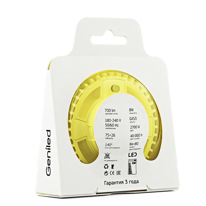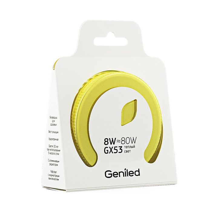Лампа светодиодная Geniled GX53 не содержит ртути, поэтому имеет высокие экологические показатели. Устройство прослужит в 40 раз дольше, чем галогенная лампа, и тем более, — чем традиционная лампа накаливания 40 Вт.