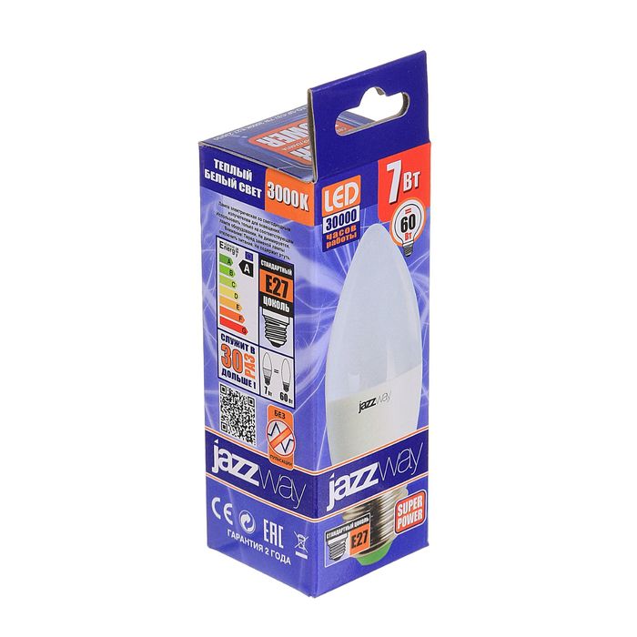 Лампа светодиодная Jazzway, C37, E27, 7 Вт, 530 Лм, 3000 K, PLED-SP