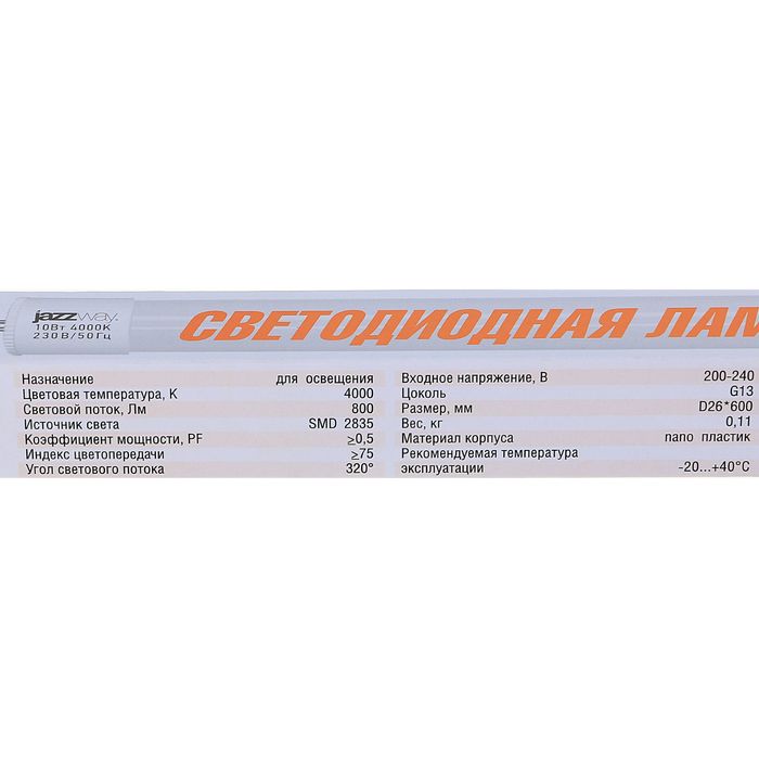Лампа светодиодная Jazzway, T8, G13, 10 Вт, 4000 K, PLED T8-600PL