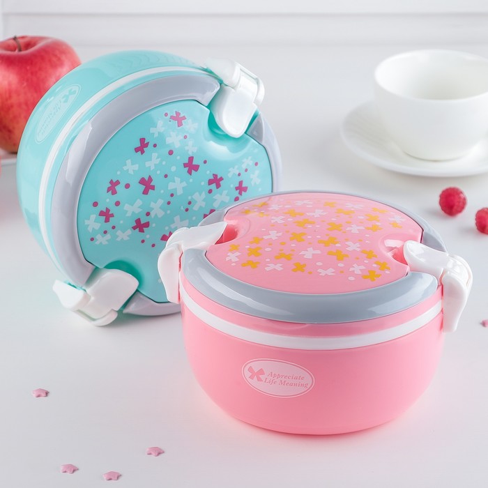 Ланч-бокс 2 уровня "Бантики" круглый 18х14,5х9,5 см с ложкой, цвета МИКС