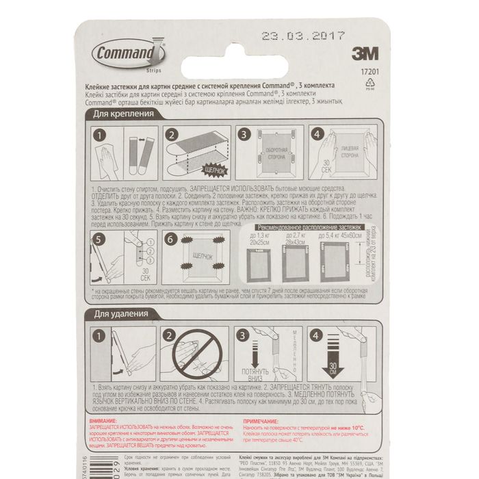 Клейкие застежки Command для картин состоят из двух частей. Одна застёжка фиксируется на стене, а другая — на раме. Благодаря этому, вы можете вешать и снимать картины, фотографии, настенные часы и другие малые декоративные предметы так часто, как пожелаете. Застёжки надёжно держат, легко удаляются и не оставляют следов на стенах.