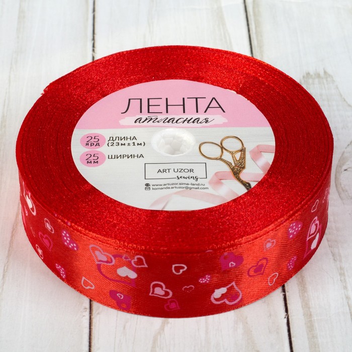 Лента атласная "Сердца", 25мм, 23±1м, №026, цвет красный