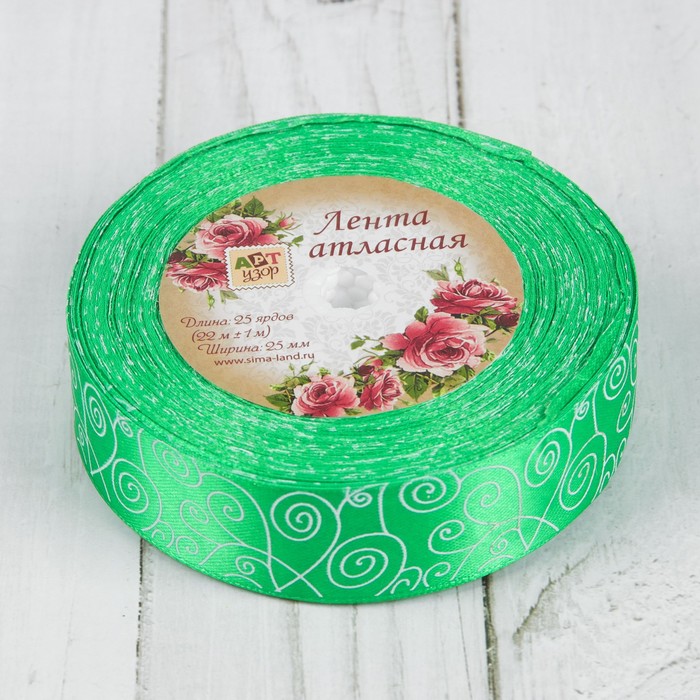 Лента атласная «Узор», 25мм х 22±1м, цвет белый/зелёный