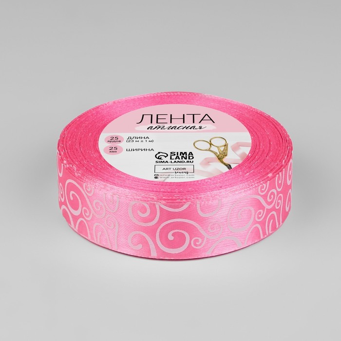 Лента атласная "Узоры", 25мм, 22±1м, №05, цвет белый/розовый