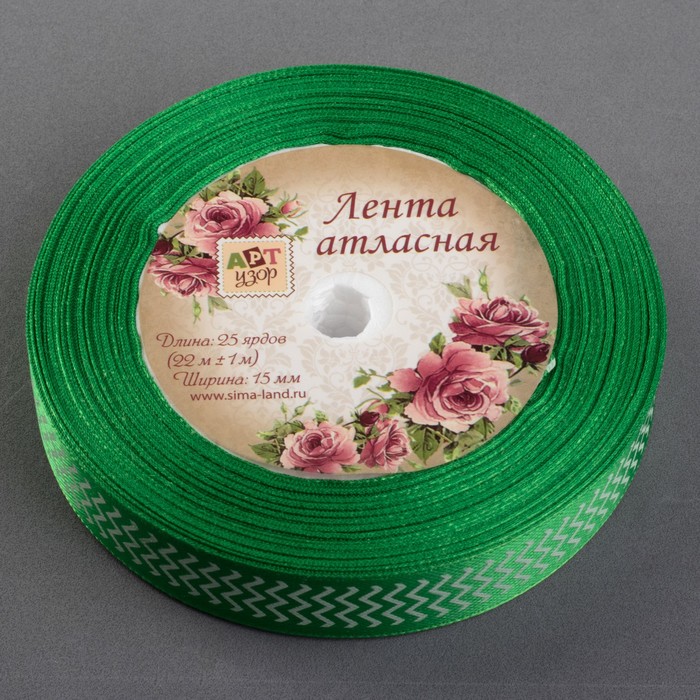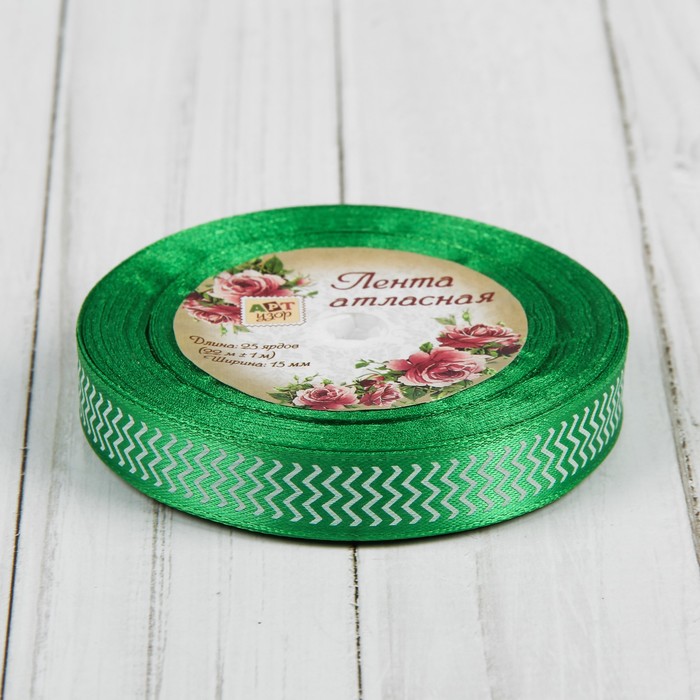 Лента атласная "Зигзаг", 15мм, 23±1м, №19, цвет белый/зелёный
