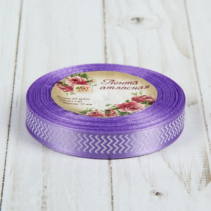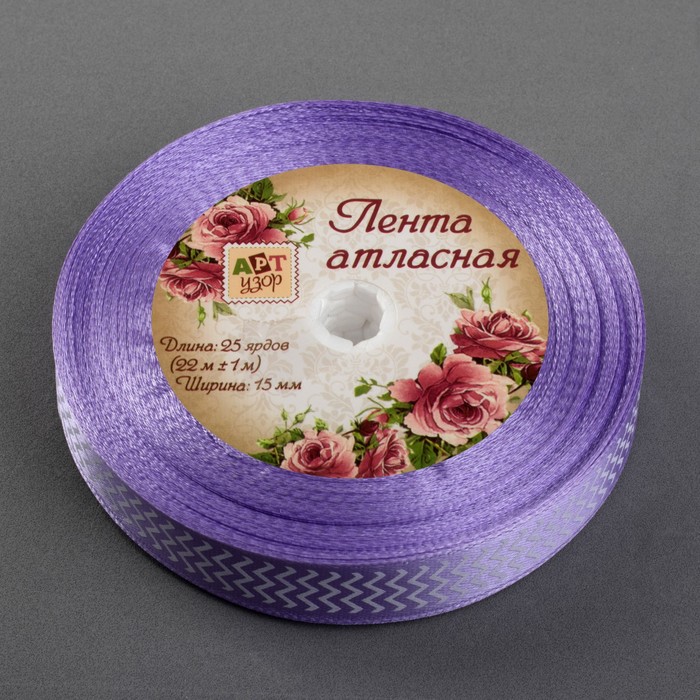 Лента атласная "Зигзаг", 15мм, 23±1м, №21, цвет белый/сиреневый