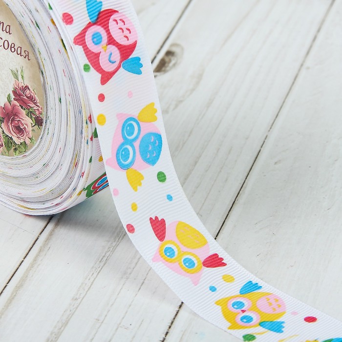 Лента репсовая "Совы", 25мм, 18±1м, цвет белый