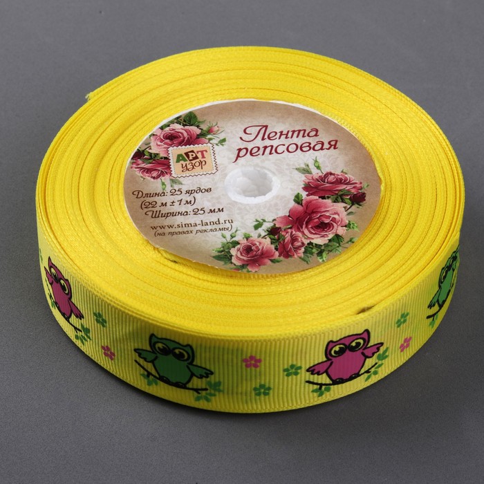 Лента репсовая "Совы", 25мм, 22±1м, цвет жёлтый совы