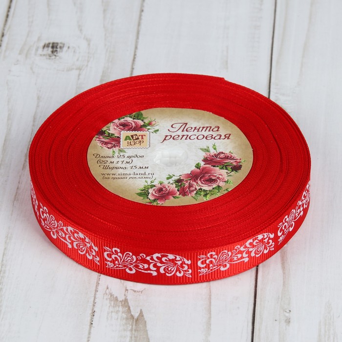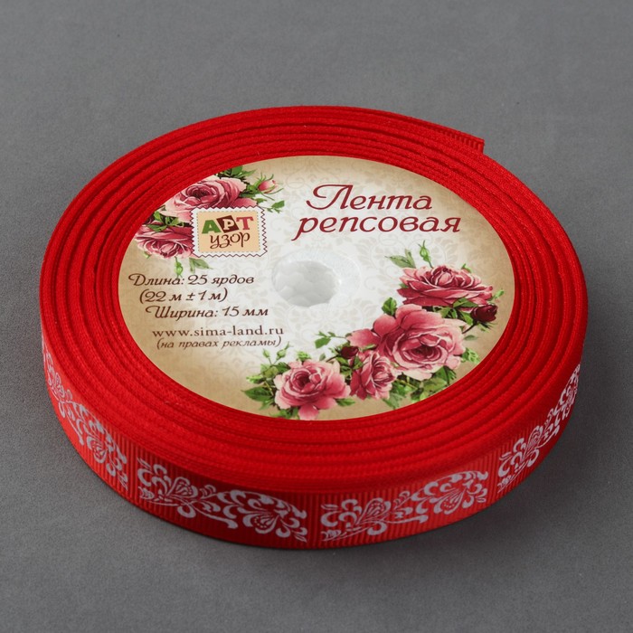 Лента репсовая "Узоры", 15мм, 22±1м, цвет красный/белый