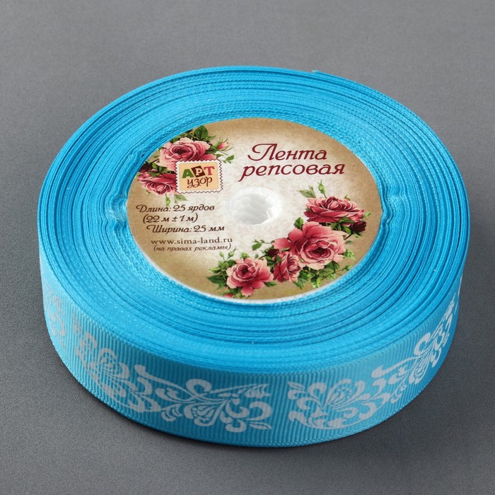 Лента репсовая "Узоры", 25мм, 22±1м, цвет голубой/белый
