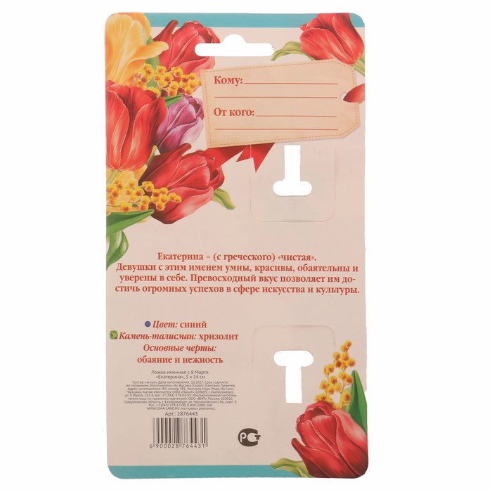 От качества посуды зависит не только вкус еды, но и здоровье человека. Ложка именная с 8 Марта "Екатерина" — товар, соответствующий российским стандартам качества. Любой хозяйке будет приятно держать его в руках. С нашей посудой и кухонной утварью приготовление еды и сервировка стола превратятся в настоящий праздник.
