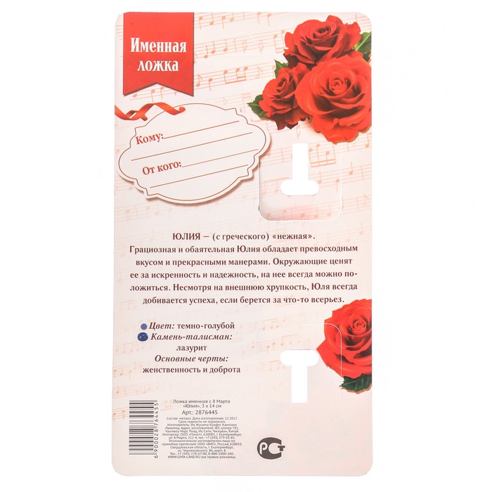 От качества посуды зависит не только вкус еды, но и здоровье человека. Ложка именная с 8 Марта "Юлия" — товар, соответствующий российским стандартам качества. Любой хозяйке будет приятно держать его в руках. С нашей посудой и кухонной утварью приготовление еды и сервировка стола превратятся в настоящий праздник.