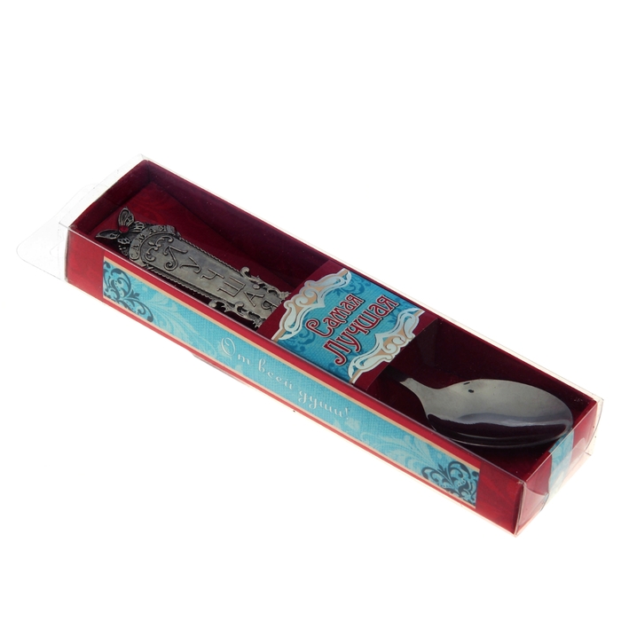 Ложка с фигурной ручкой, на которой вырезан комплимент, изготовлена из нержавеющий стали, – это позволяет использовать подарок по прямому назначению.
