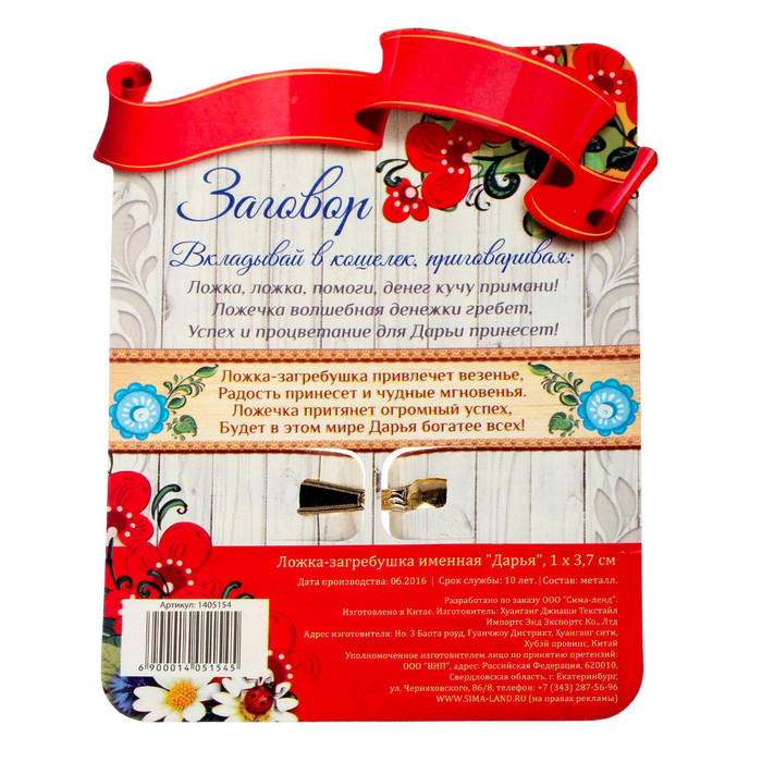 В финансовых вопросах нет незначительных деталей, поэтому мы создали серию оберегов, которые привлекут благополучие. Ложка-загребушка именная "Дарья" — изделие, которое будет защищать вас и приумножать ваши доходы. Чтобы активировать его, положите сувенир в кошелёк или сумку и произнесите несложный заговор, указанный на упаковке.
