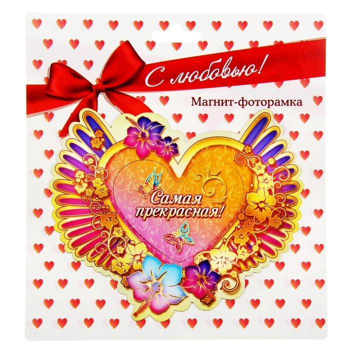 Магнит-фоторамка "Самая прекрасная" — приятный и практичный сувенир. С одной стороны — это яркая рамка, которая украсит снимки и позволит разместить их на холодильнике или другой металлической поверхности. С другой стороны — ещё и магнит-валентинка, который вынимается из центральной части рамки.