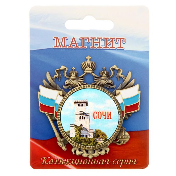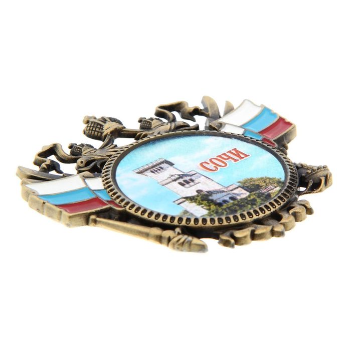 Магнит герб «Сочи» — прекрасный коллекционный подарок. Эксклюзивная форма металлического магнита под герб привлечёт внимание каждого, а яркая фольгированная вставка напомнит о путешествии по любимым места.
