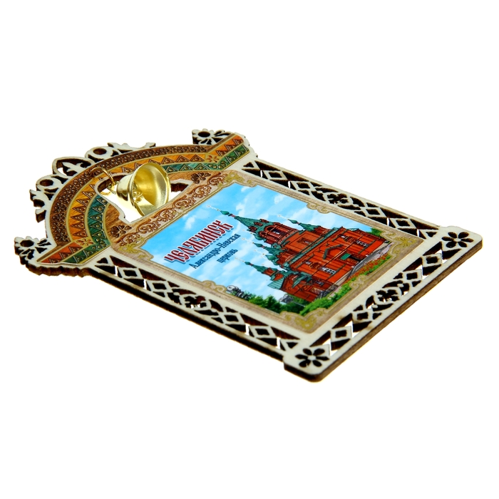 Резной магнит с колокольчиком изготовлен из натурального материала — дерева. На магните изображена Александро-Невская церковь — величественное сооружение, построенное из красного кирпича в 1916 г. на Алом поле в Челябинске. Небывалое искусство соединилось с церковной тематикой, так и появилось величественное богослужебное заведение.