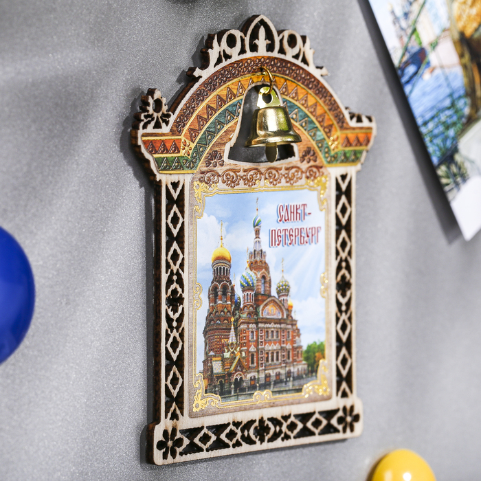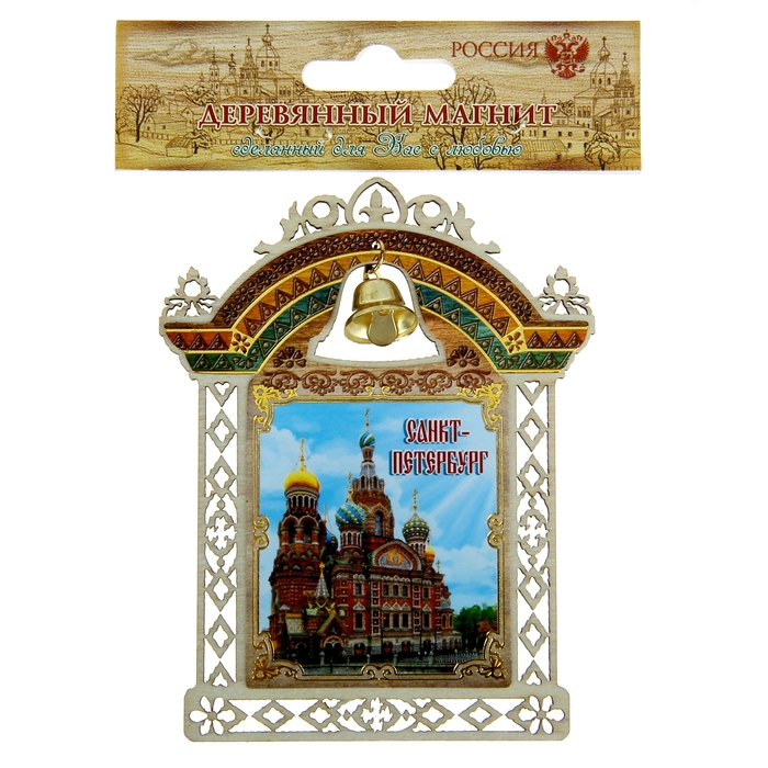 Резной магнит с колокольчиком изготовлен из натурального материала — дерева. На магните изображён Храм Спаса-на-Крови. Одна из самых значительных церковных построек в России рубежа XIX и XX веков, а ныне популярнейшая достопримечательность Санкт-Петербурга. Лакомо-многоцветный, сияющий золотом, мозаикой и эмалью, вырастает его силуэт над гладью канала Грибоедова. Несмотря на его праздничный вид, собор построен на месте одного из самых трагических событий в истории России — смертельного ранения Александра II. Его сын, Александр III, приказал построить на этом месте церковь для регулярных служб по убиенному. Именно поэтому за храмом закрепилось название Спас-на-Крови, хотя официально он называется Храм Воскресения Христова.