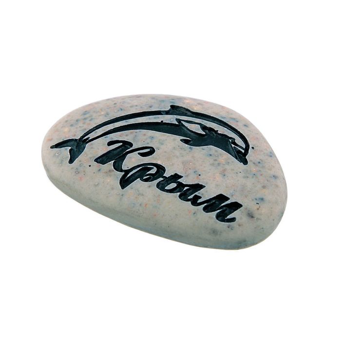 Сувенир имитирует речной или морской камушек с выгравированным изображением, залитым краской.