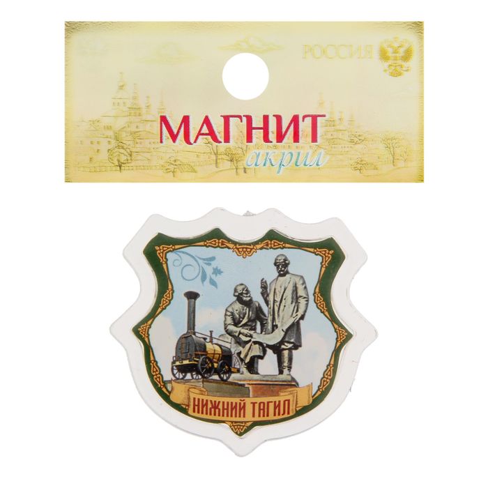 На магните изображён памятник отцу и сыну Черепановым (Ефиму Алексеевичу и Мирону Ефимовичу), которые внесли огромный вклад в развитие железнодорожного транспорта страны — изобрели первый российский паровоз. Постамент был воздвигнут на Театральной площади в ноябре 1965 года по проекту А. В. Сотникова и стал важной достопримечательностью города.